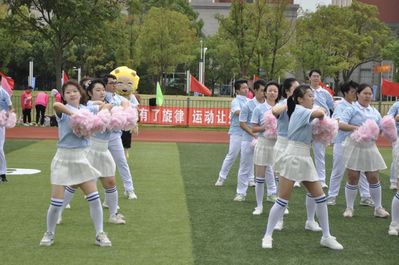 之后进行的团体操表演中,由50名公卫学生组成的方阵,以整齐的队列跑步入场。他们穿着蓝色的统一服装,手拿粉色的花球,跟随着音乐、富有节奏地舞动着,时而变化出花样队形,充分地展现青春的活力与热情。每一个动作,都经过了编舞者精心的设计,每一个舞步,背后都是他们挥洒的汗水。