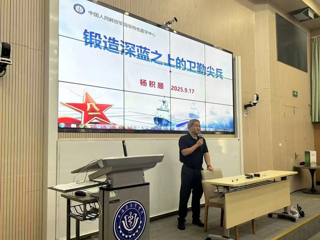 接着,海军特色医学中心医疗保障中心主任杨积顺发表讲话。他带领全体新生回顾并学习了习近平2025年9月3日在纪念中国人民抗日战争暨世界反法西斯战争胜利80周年大会上的讲话,以“锻造深蓝之上的卫勤尖兵”为题,结合自身多年在部队的公共卫生工作实践,激励各位新生将个人理想与国家需求紧密相连,胸怀“国之大者”,找准自身定位。