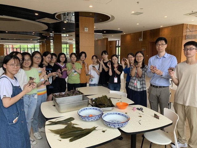 公卫师生热情高涨地围在食堂大师傅身边学习如何包粽子,捻两片完好的粽叶,交叉对折,形成漏斗形,往里面添加糯米和馅料,再用彩色的绳子捆绑起来。用精肉和蜜枣来做馅料,是希望大家对生活充满着干劲以及在生活中要甜甜蜜蜜。同学们来自全国各地,家乡的粽子馅料和形状都不尽相同,但对过去的美好回忆是一样的。小时候看到妈妈包,但是自己包是第一次。同学们都非常好学,在包粽子的过程中,遇到困难积极去克服,向食堂大师傅一遍又一遍的讨教,大师傅也不厌其烦地教学。在一片祥和的气氛中,一个个略带稚嫩的粽子便出现了。公卫师生们其乐融融地围在桌子边,一边包粽子一边谈论家乡的美食。在学到一门新手艺的同时,也感受到公卫大家庭的温暖。