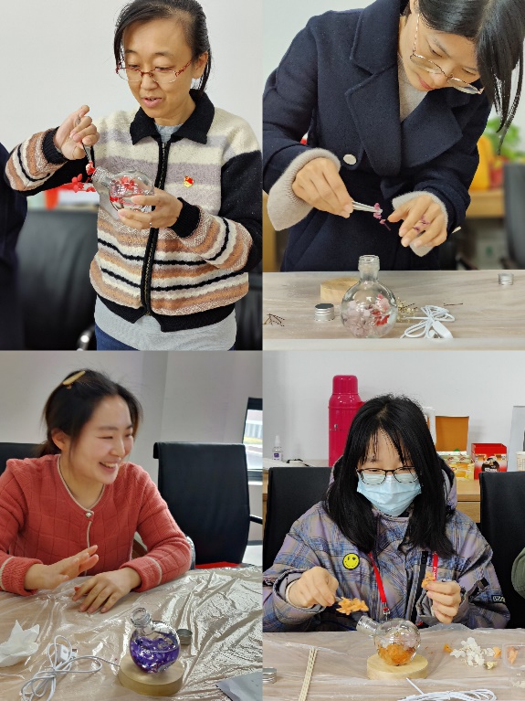 工会现场为老师们提供了玻璃器皿、LED底座、各类永生花、香薰精油以及制作工具。经指导,老师们按照自己的品味与色彩搭配,用镊子把花瓣小心翼翼地放入玻璃瓶内,浇上一层透明油,再通过个人喜好,选出一款最喜欢的精油滴入其中。就这样,一款美丽芬芳的浮游香薰灯就制作完成了。
