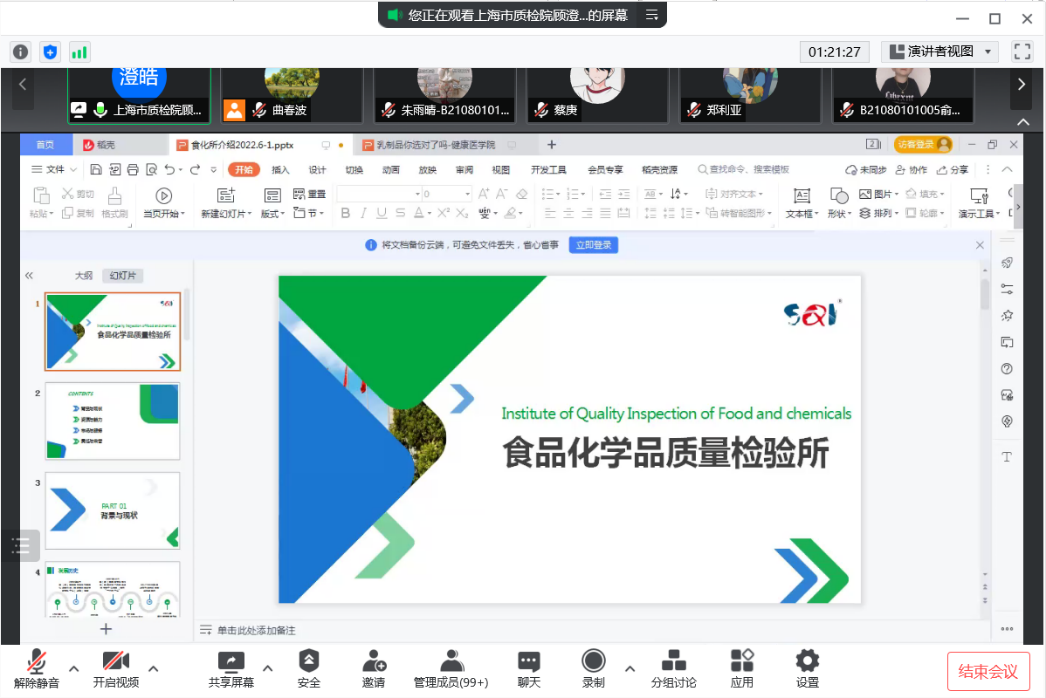 科技兴则民族兴,科技强则国家强。两位专家为大家分享了上海市质检院食化所的工作,从讲座中得知食化所作为国内领先的食品、化妆品检验检测机构,深知科研创新对于检验检测机构的重要性,食化所青年们打破常规、大胆创新,率先在行业内建立起风险分析和预警工作机制,主动介入食品风险预警和新标准、新方法的研究。在讲座最后两位专家号召参加的学生们充分利用在校期间好好学习,为以后的职业和人生发展奠定基础,也为国家和社会发展贡献力量。