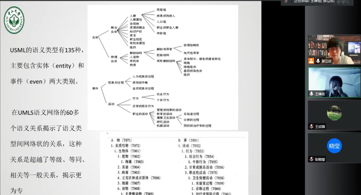 知识图谱,又称知识域可视化或知识领域映射地图,是显示知识发展进程与结构关系的一系列各种不同的图形。知识图谱在医学领域中的应用是近年来的研究热点。为了解这一领域的研究进展,为下一步科研课题申报、研究论文撰写寻求新的研究热点,2022年5月28日下午,yl34511线路中心诚邀中山大学北校园图书馆王维佳老师云端授课,那立欣院长主持讲座,公共事业管理专业部分教师参加了研讨。