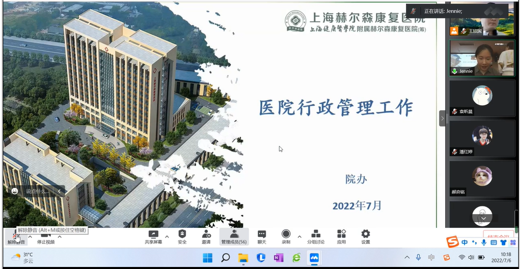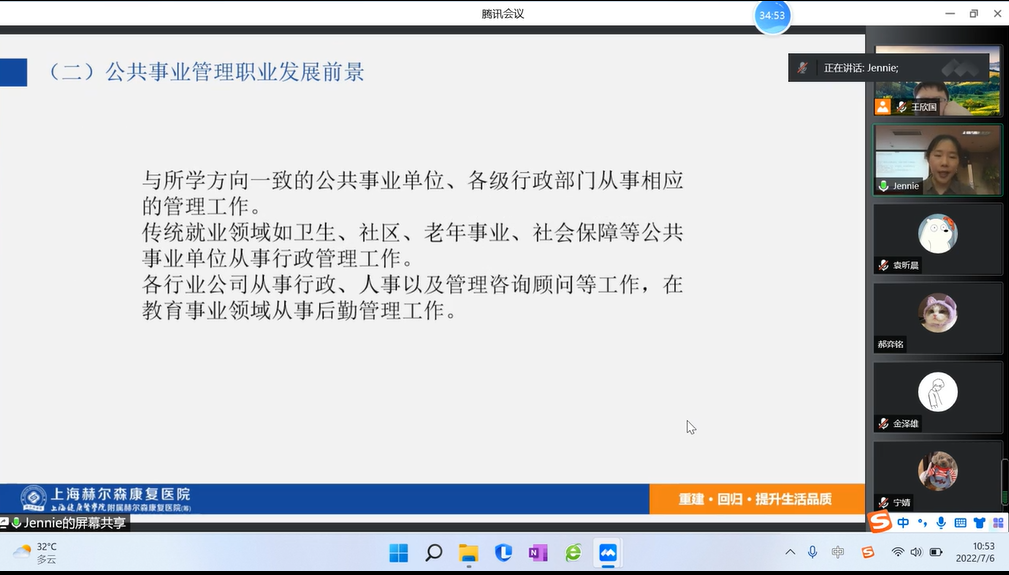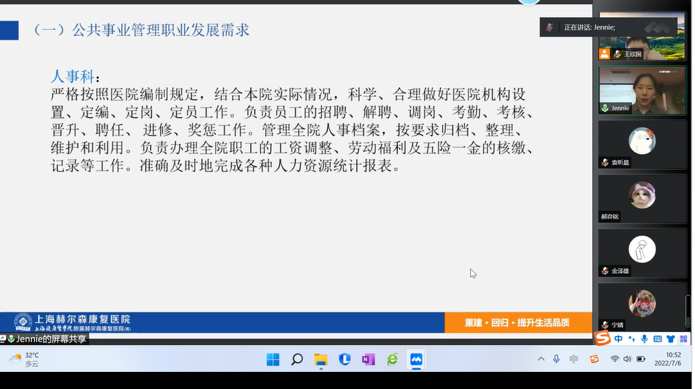 郑佩文老师从医院的组织架构,党政办规章制度和岗位职责,职业发展需求前景这三个部分展开讲座,结合赫尔森康复医院的实际情况,与在线的同学们进行分享交流。